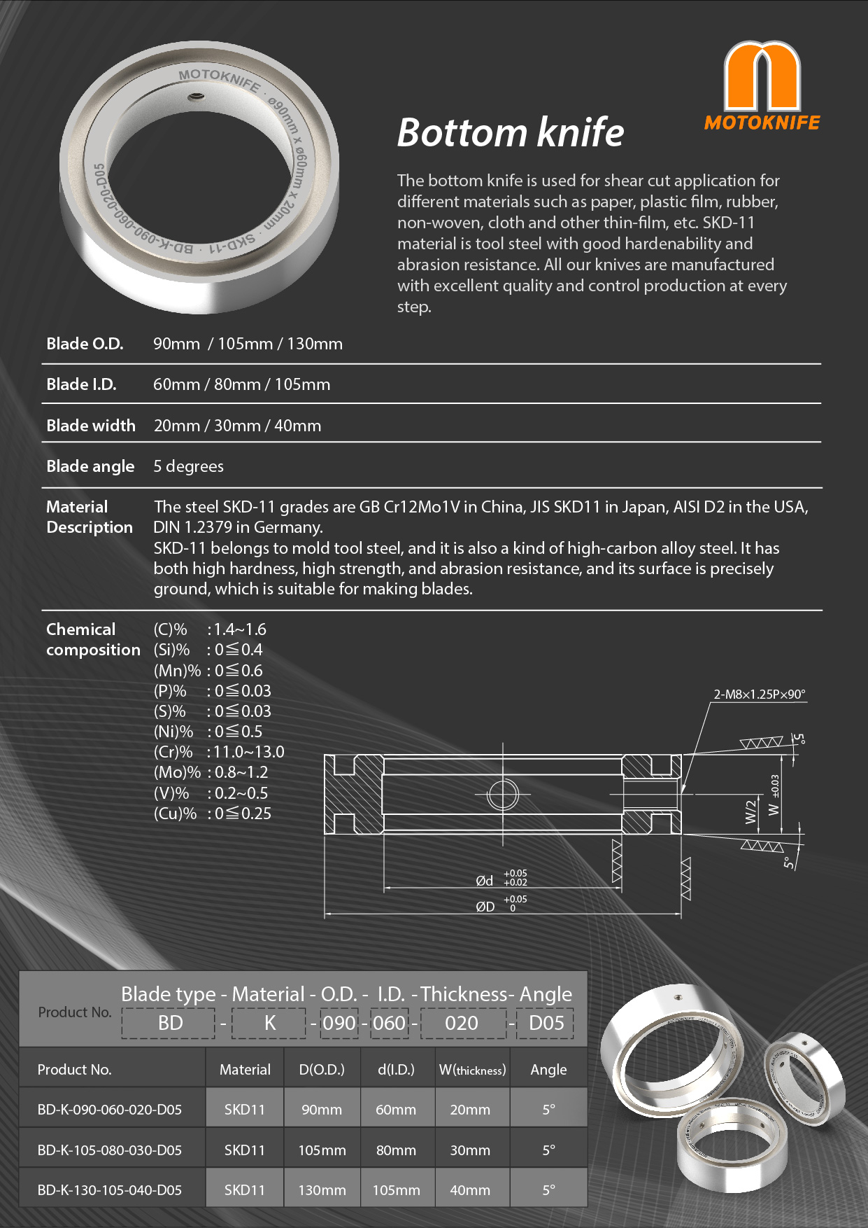 The bottom knife is used for shear cut application for different materials such as paper, plastic film, rubber,non-woven, cloth and other thin-film, etc. SKD11 material is tool steel with good hardenability and abrasion resistance. All our knives are manufactured with excellent quality and control production at every step.