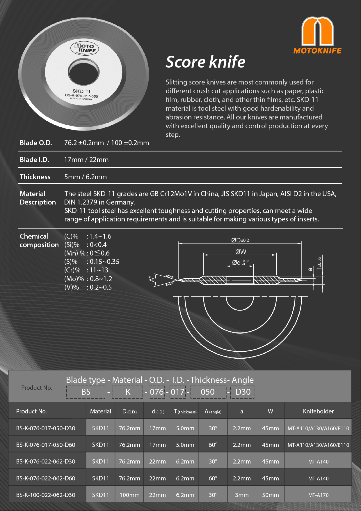 Slitting score knives is most commonly used for different crush cut applications such as paper, plastic film, rubber, cloth, and other thin films, etc. SKD-11 material is tool steel with good hardenability and abrasion resistance. All our knives are manufactured with excellent quality and control production at every step.