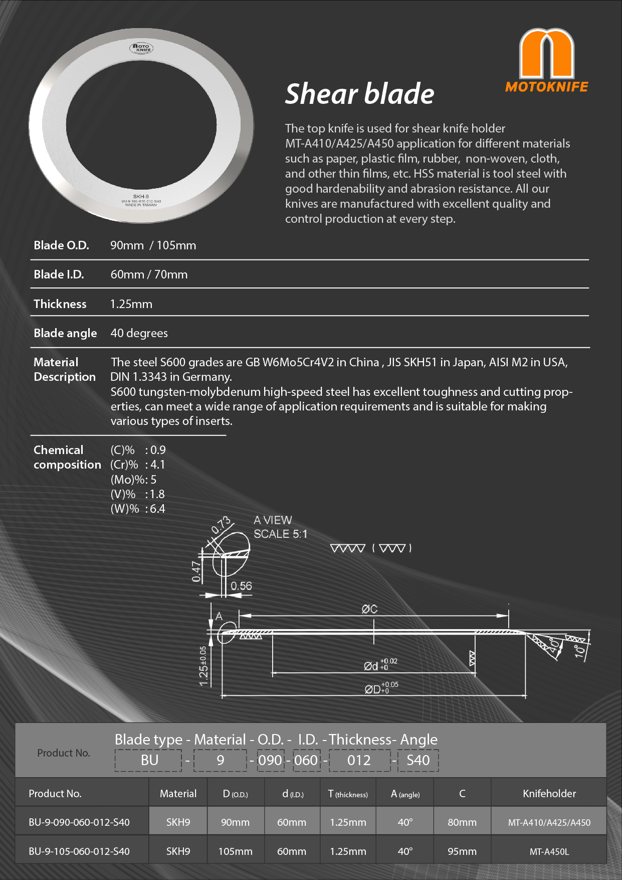 The top knife is used for shear knife holder MT-A410/A425/A450 application for different materials such as paper, plastic film , rubber,non-woven, cloth, and other thin films etc. HSS material is tool steel with good hardenability and abrasion resistance. All our knives are manufactured with excellent quality and control production at every step.