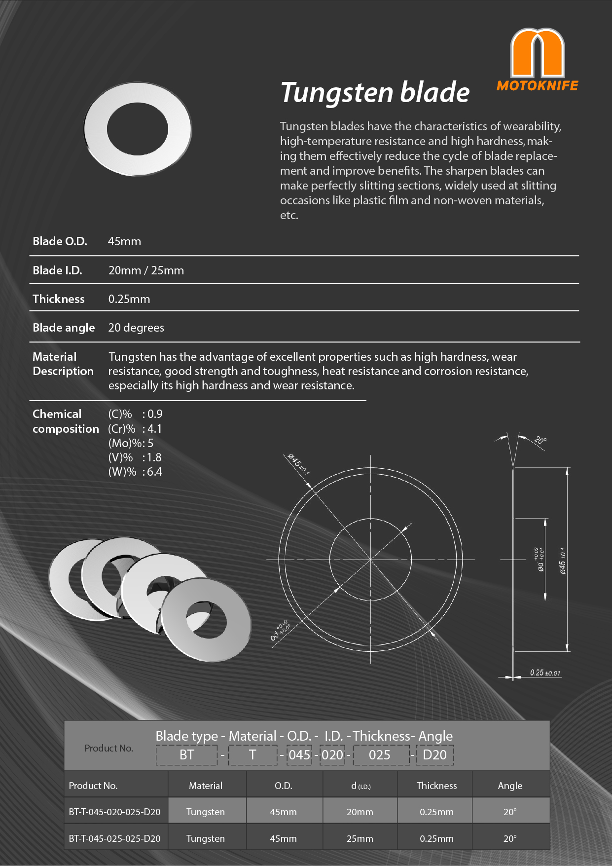 Tungsten blades have the characteristics of wearability, high-temperature resistant and high hardness, which can effectively reduce the cycle of blade replacement and improve benefits. Slitting occasions of plastic film and non-woven materials.